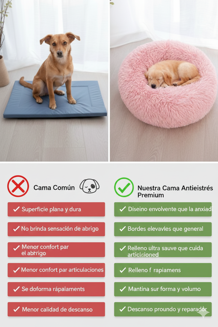 Nuestra cama antiestrés fue diseñada para mejorar el descanso, reducir el estrés y cuidar la salud de tu mascota todos los días.