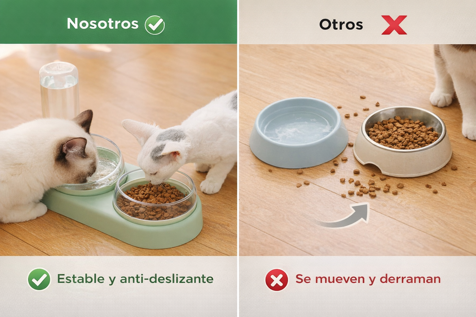 Comida y agua siempre en su lugar, sin derrames ni desorden
